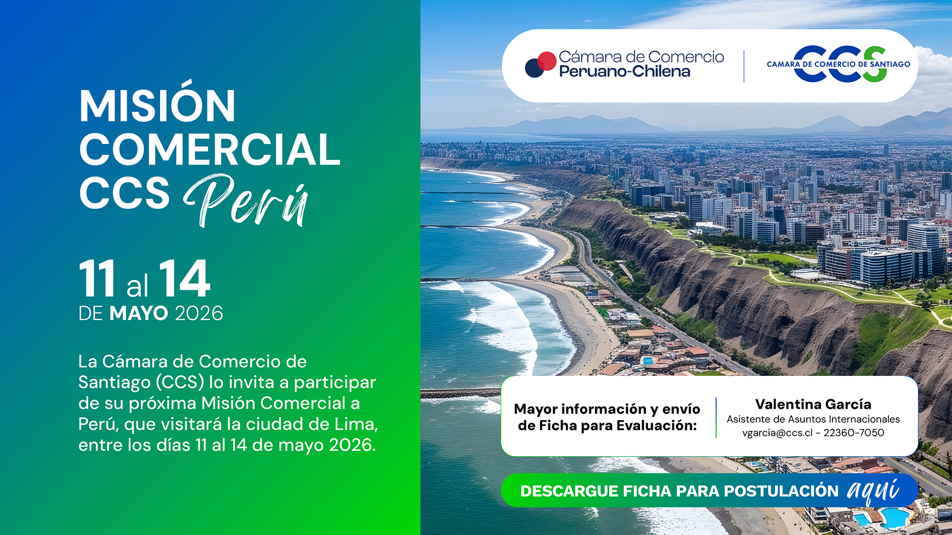 La CCS invita a sus socios y empresas a participar en la Misión Comercial a Perú, que se realizará en Lima entre el 11 y el 14 de mayo de 2026, en conjunto con la Cámara de Comercio Peruano-Chilena.