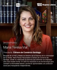 La presidenta de la Cámara de Comercio de Santiago (CCS), María Teresa Vial, fue reconocida por tercera vez entre las 100 Mujeres Líderes, esta vez en la categoría Servicio Público, por su trayectoria al frente del gremio y su permanente impulso a la sostenibilidad, la innovación y la colaboración público-privada en beneficio del comercio y las empresas del país.