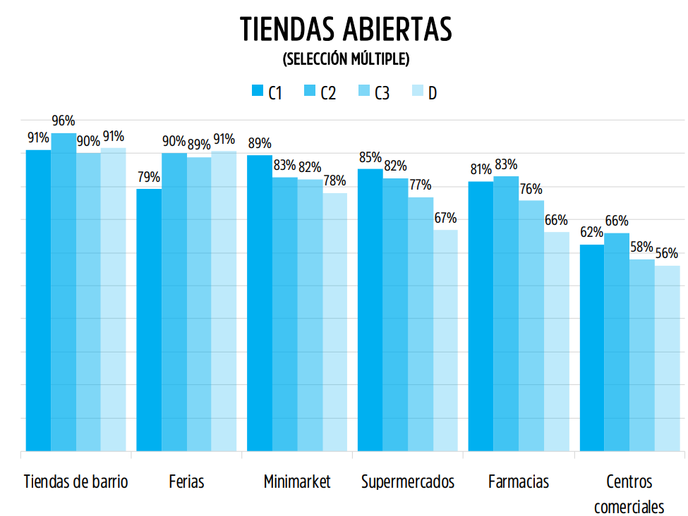 En el caso de vestuario y calzado, el índice se redujo de 41 a 32% y de 33 a 26%, respectivamente. Pese a ello, ambas categorías se ubican en niveles muy superiores a los observados en marzo pasado, cuando por efecto de la pandemia se contrajeron violentamente hacia cifras en torno al 5%.