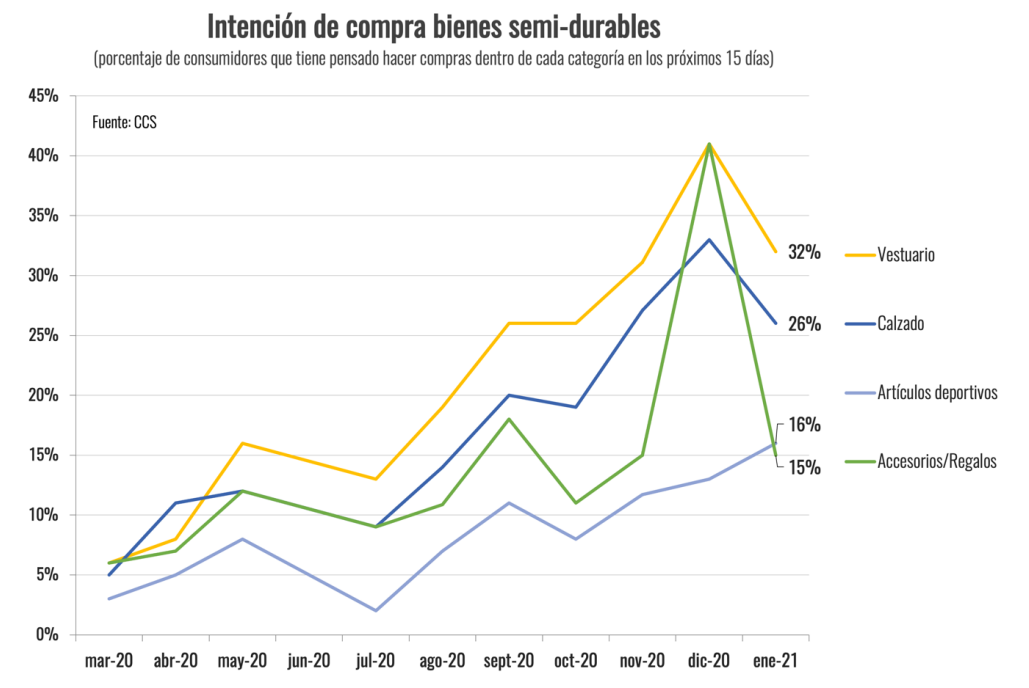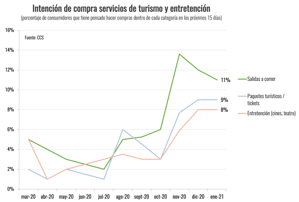 Luego de varios meses al alza, la intención de compra por parte de los consumidores retrocedió en la mayoría de las categorías de bienes y servicios durante enero de 2021, de acuerdo a la encuesta que elabora mensualmente la CCS. Los únicos rubros que presentaron alzas corresponden a artículos deportivos y comida preparada (delivery). En la mayoría de los casos, sin embargo, la disminución observada es consistente con el comportamiento estacional de la demanda, luego de la temporada navideña.