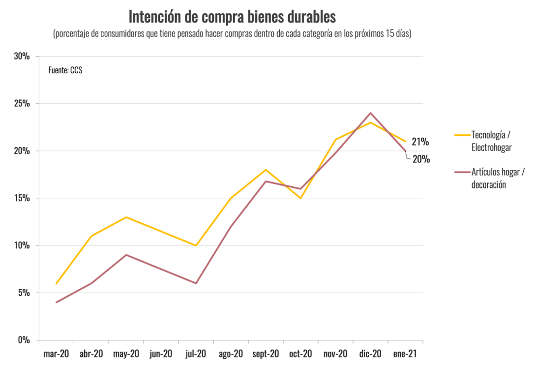 En el área de bienes de consumo durable, como tecnología, electrohogar y artículos de decoración, la intención de compra, que también se había situado en torno al 5% en marzo de 2020, bajó desde cerca del 25% en diciembre a los alrededores del 20% en enero. Esta área es posiblemente la que refleja con mayor nitidez el impacto del primer retiro de fondos previsionales, con una fuerte recuperación en septiembre pasado, producto del aumento en la demanda generado por la mayor liquidez de los hogares.