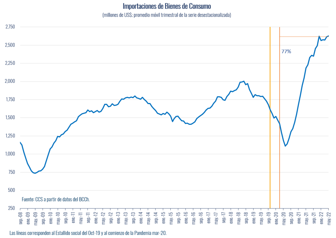 Cabe mencionar, que el nivel actual de importaciones de consumo supera en un 77% el nivel observado en la prepandemia.
