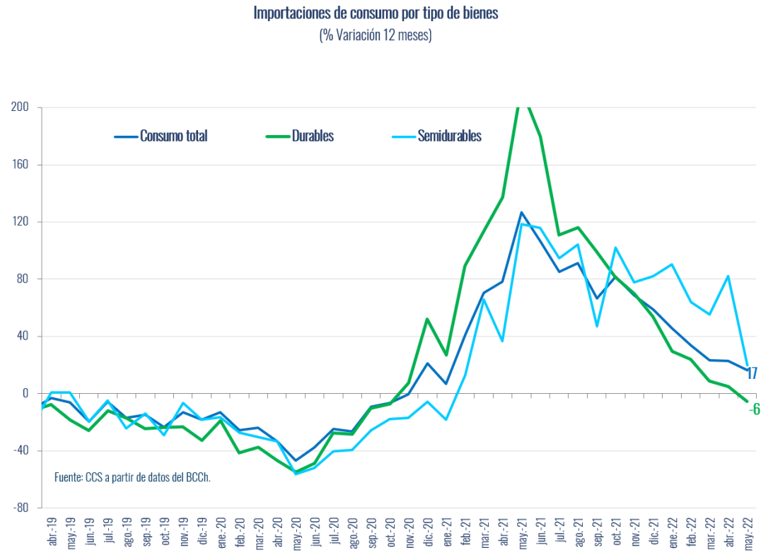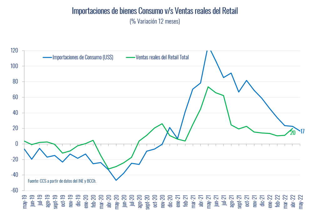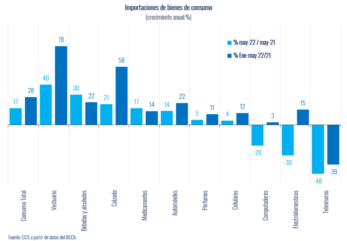 De acuerdo a información del Banco Central de Chile, las importaciones de bienes de consumo crecieron un 16,5% en 12 meses en mayo, acumulando un alza de 27,6% en los cinco primeros meses del año. Luego de una larga trayectoria de contracciones, las internaciones de este tipo de bienes iniciaron una fuerte recuperación a partir de fines de 2020, junto al ciclo de mayor demanda originado en el aumento de la liquidez de los hogares.