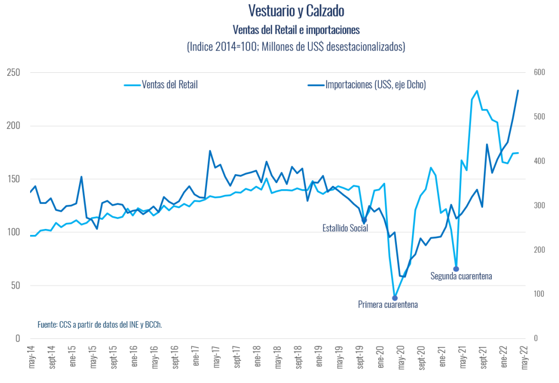 Estos resultados responden al aumento de la demanda por estos bienes. Es así como en abril de este año las ventas del Retail de Calzado y vestuario crecieron 174% en 12 meses, luego de que 2021 cerrara con una alza 56%, registros que también son catalogados como históricamente altos. En términos de niveles, las ventas locales de estos bienes ya superan en un 23% a los observados previo a la pandemia.