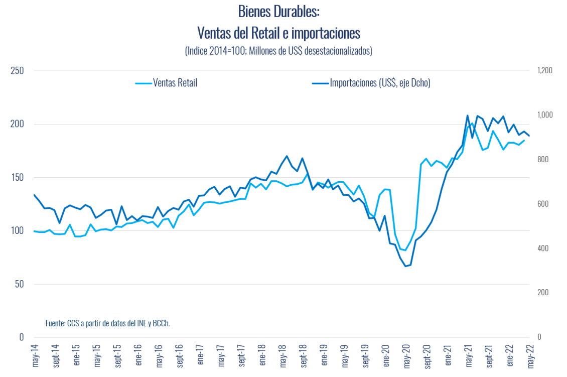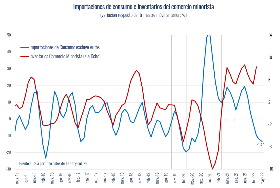 Los bienes durables, en tanto, tuvieron una trayectoria de crecimiento de dos dígitos desde fines del 2020, producto de los retiros previsionales y las ayudas fiscales. En la medida que el mayor ingreso de los hogares se fue disipando, las internaciones de estos bienes también se han ido desacelerando sostenidamente. Es así como en mayo las importaciones de estos bienes cayeron 5,5% en 12 meses y acumularon un alza de 11% anual en el año.