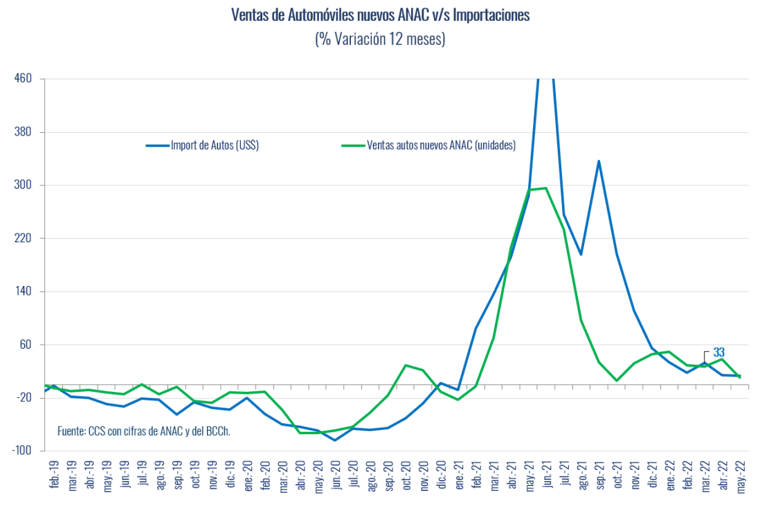 Las importaciones de automóviles, en tanto, han destacado por su dinamismo, anotando registros récord en forma consecutiva durante los últimos trimestres. En mayo de este año crecieron 13,8% anual y en lo que va del año acumulan un aumento de 21,8% en 12 meses.