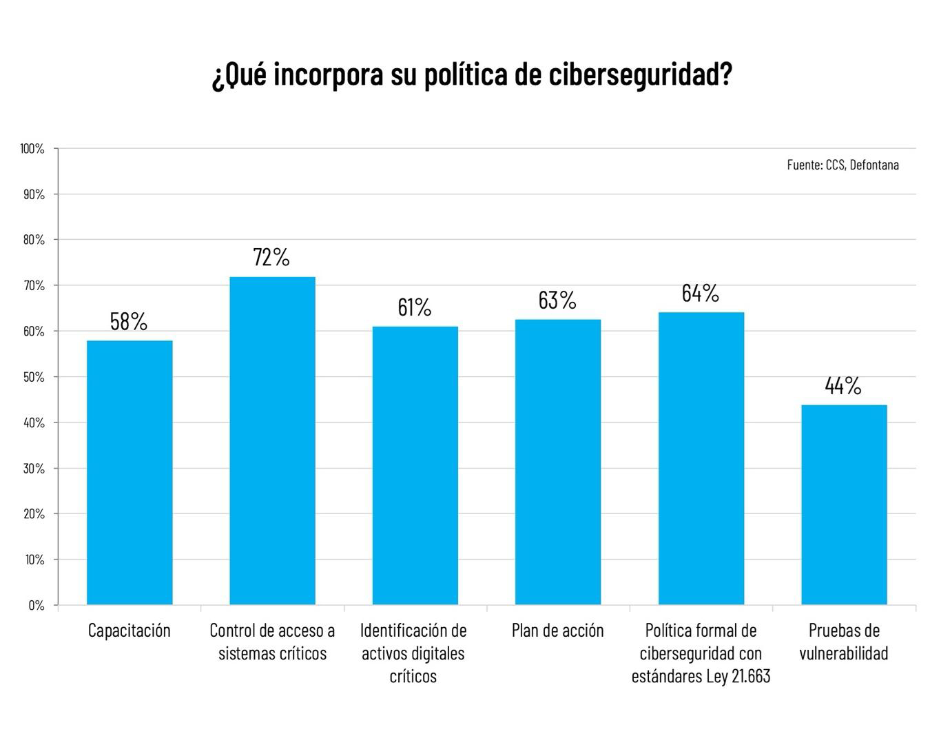 El control de acceso a sistemas críticos emerge como el componente más prevalente (72%), seguido por políticas formales alineadas con la Ley 21.663 (64%), y planes de acción (63%). La capacitación presenta un nivel intermedio (58%), mientras que las pruebas de vulnerabilidad muestran la menor implementación (44%).