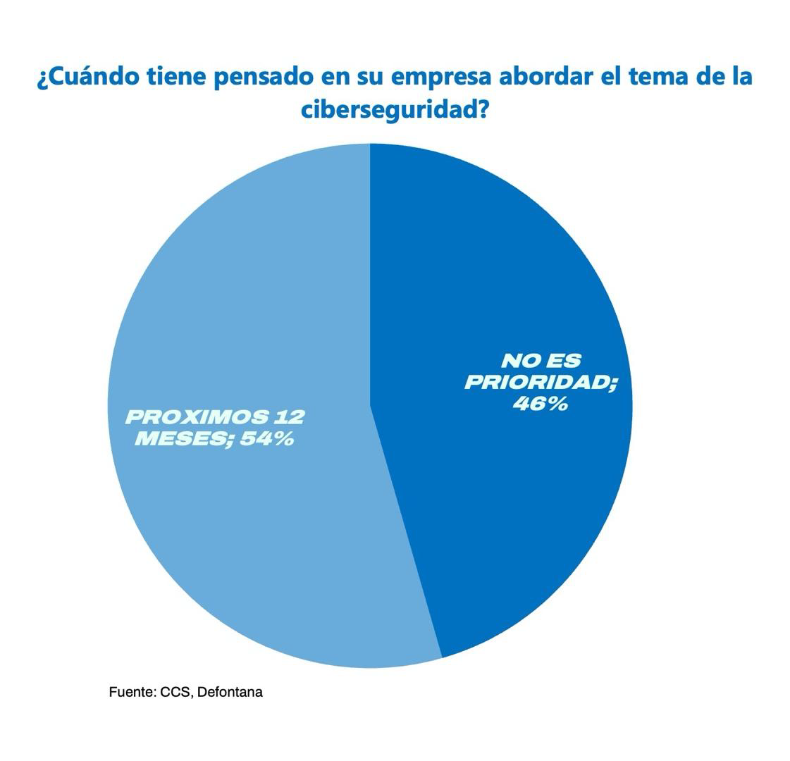 Los datos muestran una ligera inclinación hacia la implementación futura, con 54% planificando abordar ciberseguridad en los próximos 12 meses y 46% sin considerarlo prioritario