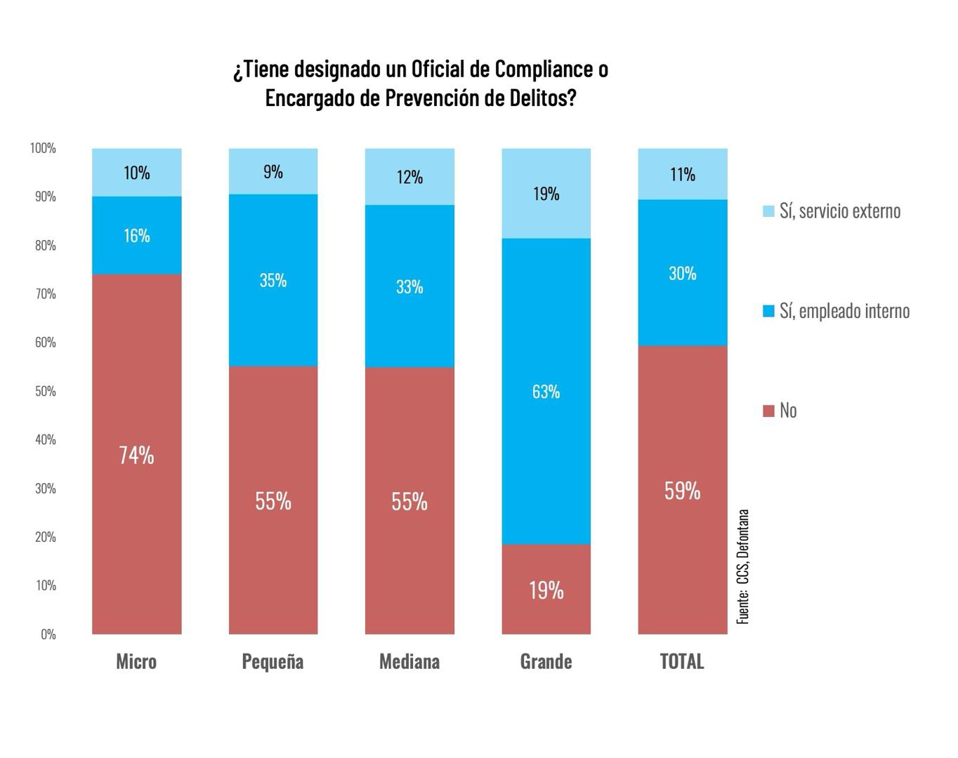 Los resultados revelan que 59% de las empresas carecen de oficiales de compliance designados. Entre las que sí cuentan con esta función, predominan los servicios externos (30%), sobre empleados internos (11%). Las grandes empresas muestran un patrón inverso, con 63% utilizando servicios externos y 19% empleados internos, mientras que un 74% de las microempresas carecen completamente de esta función.