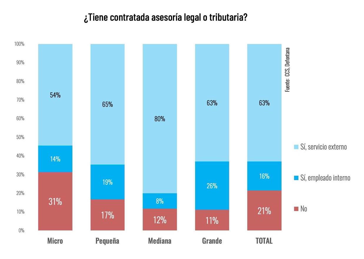 Finalmente, el informe examina en qué medida las empresas cuentan con asesoría legal o tributaria externa o interna de forma permanente, lo cual es indicativo de su capacidad para manejar temas complejos de normativa, impuestos y contratos.