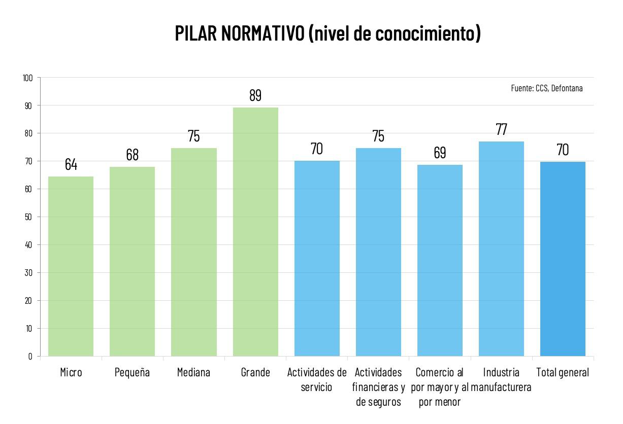 El pilar normativo mide el nivel de conocimiento declarado por las empresas respecto al marco regulatorio aplicable, representando la dimensión cognitiva del compliance empresarial.