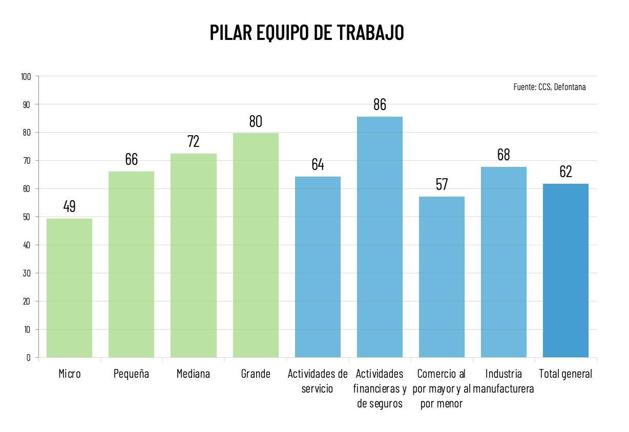 Esta dimensión presenta un promedio de 62 puntos sobre 100, también con una distribución fuertemente estratificada por tamaño empresarial. Las microempresas alcanzan la menor puntuación, con 49 puntos, mientras que las grandes empresas lideran con 80 puntos, generando una brecha de 31 puntos, la más amplia entre los tres pilares analizados.