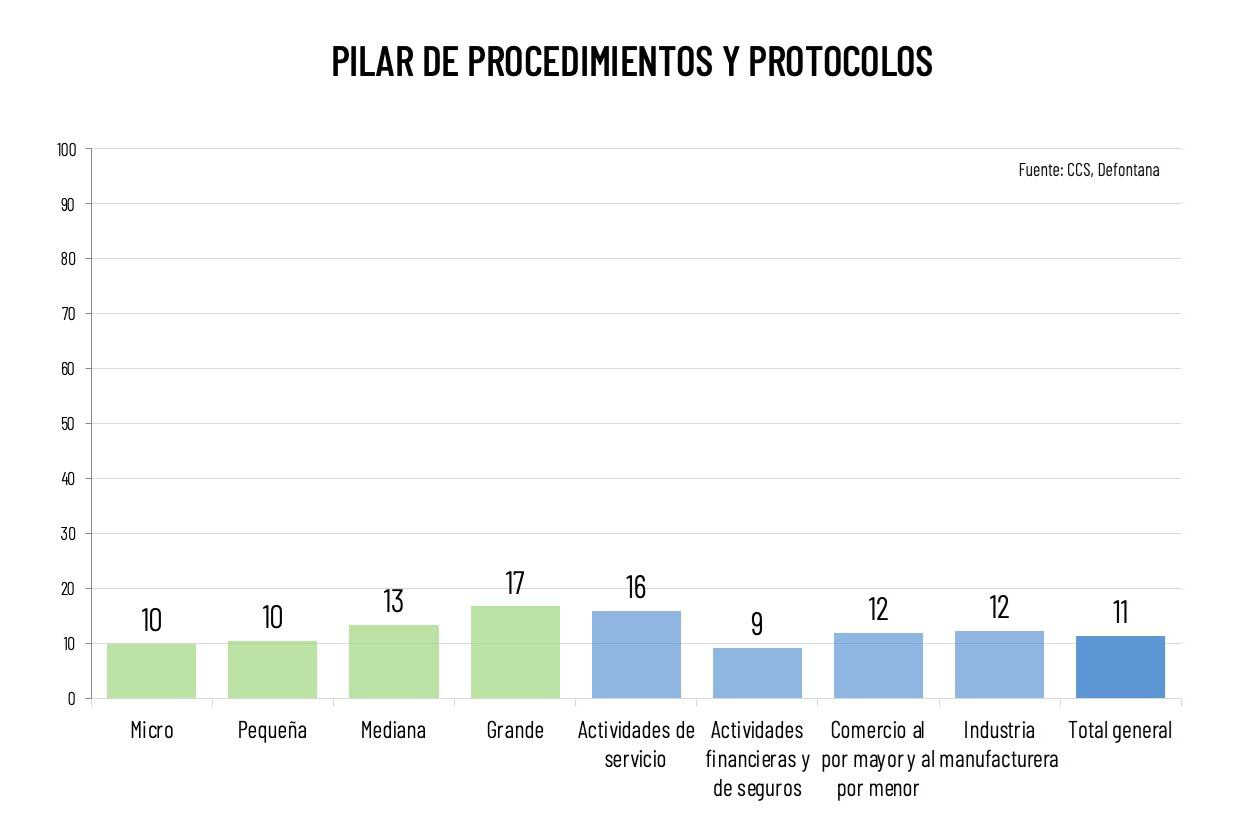 El pilar de Procedimientos y Protocolos, en tanto, mide la existencia de procedimientos formales, protocolos documentados y marcos institucionales estructurados para la gestión del compliance empresarial.
