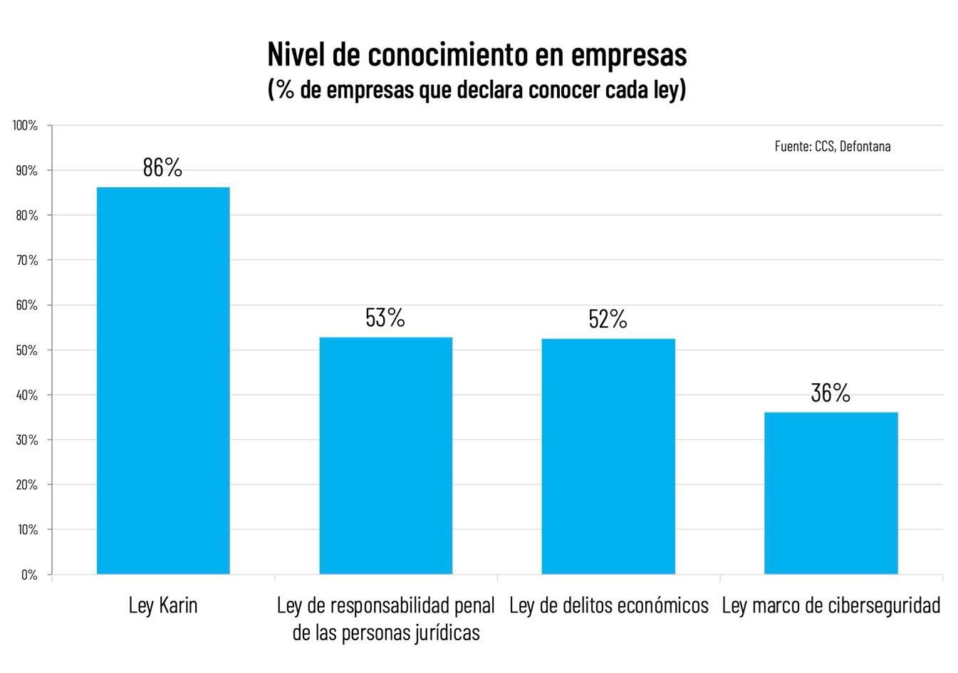 Los datos revelan una marcada heterogeneidad en el conocimiento normativo empresarial. La Ley Karin presenta el mayor nivel de reconocimiento con un 86% de las empresas encuestadas, seguida por la Ley de Responsabilidad Penal de las Personas Jurídicas (53%) y la Ley de Delitos Económicos (52%), ambas con un nivel de conocimiento intermedio. La Ley Marco de Ciberseguridad presenta la menor penetración, con apenas 36% de conocimiento entre las firmas de la muestra.