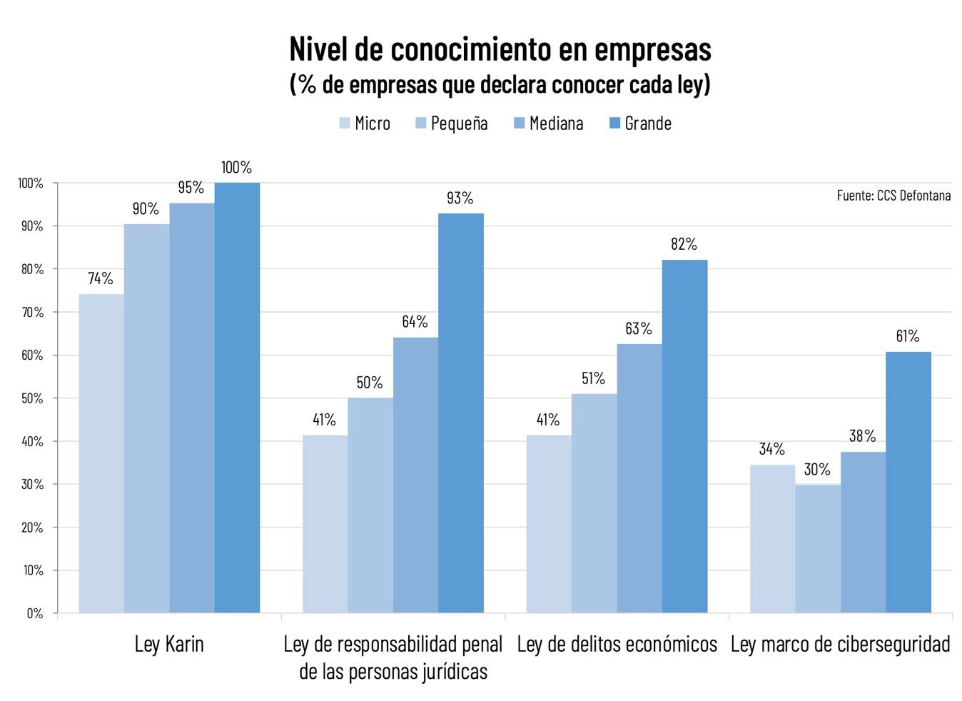 Los datos evidencian, además, una correlación positiva robusta entre el tamaño empresarial y el conocimiento normativo. Las grandes empresas alcanzan niveles de conocimiento cercanos o iguales al 100% en Ley Karin y Responsabilidad Penal (100% y 93% respectivamente), mientras que las microempresas presentan los menores niveles en todas las categorías normativas. Particularmente notable es la brecha en ciberseguridad, donde las grandes empresas triplican el conocimiento de las micro y pequeñas empresas (61% vs. 34% y 30%, respectivamente).