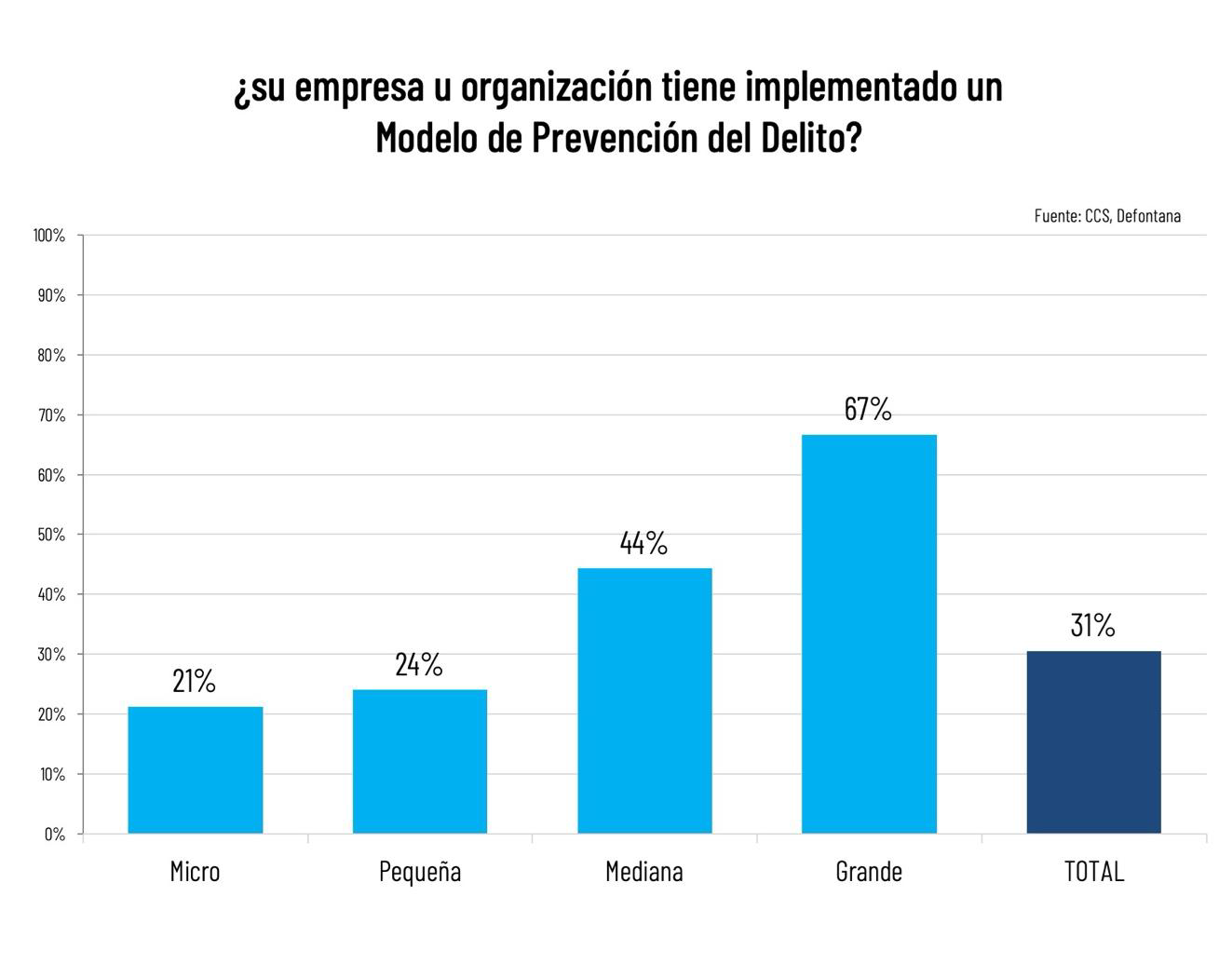 Los resultados revelan una implementación del modelo de prevención del delito altamente estratificada por tamaño. Las empresas grandes presentan una tasa de implementación del 67%, contrastando significativamente con las microempresas (21%). El promedio general de implementación del 31% indica que aproximadamente dos tercios de las empresas chilenas no han materializado sistemas formales de prevención en esta área.