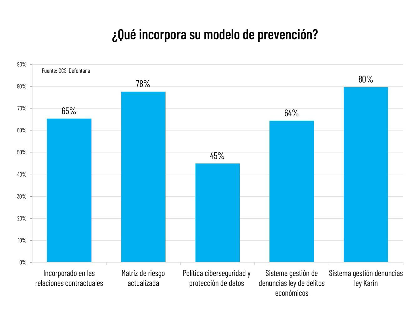 El análisis de los contenidos de los modelos de prevención revela una priorización hacia sistemas de gestión de denuncias, con la Ley Karin liderando (80%), seguida por la matriz de riesgo actualizada (78%). Los componentes contractuales (65%) y los sistemas de gestión de denuncias de delitos económicos (64%), presentan niveles intermedios, mientras que las políticas de ciberseguridad y protección de datos muestran la menor incorporación (45%).