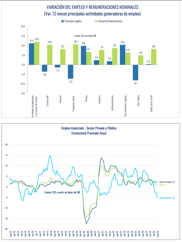 En el caso de las alzas desproporcionadas del salario mínimo entre 2023 y 2025, se presentan antecedentes que muestran aumentos de costos laborales anormales en las empresas más afectas a éste, así como una mayor pérdida de empleo. Según las estimaciones presentadas, un incremento real del salario mínimo similar a lo observado desde 2023 provoca una caída de aproximadamente -1,5% en el empleo asalariado formal, e incentiva un incremento en la informalidad. También se concluye que en el último año, distintos shocks de oferta y de costos —incluyendo el alza del salario mínimo y la ley de 40 horas— explican la mayor parte del alza de los costos laborales y han incidido negativamente en el empleo.