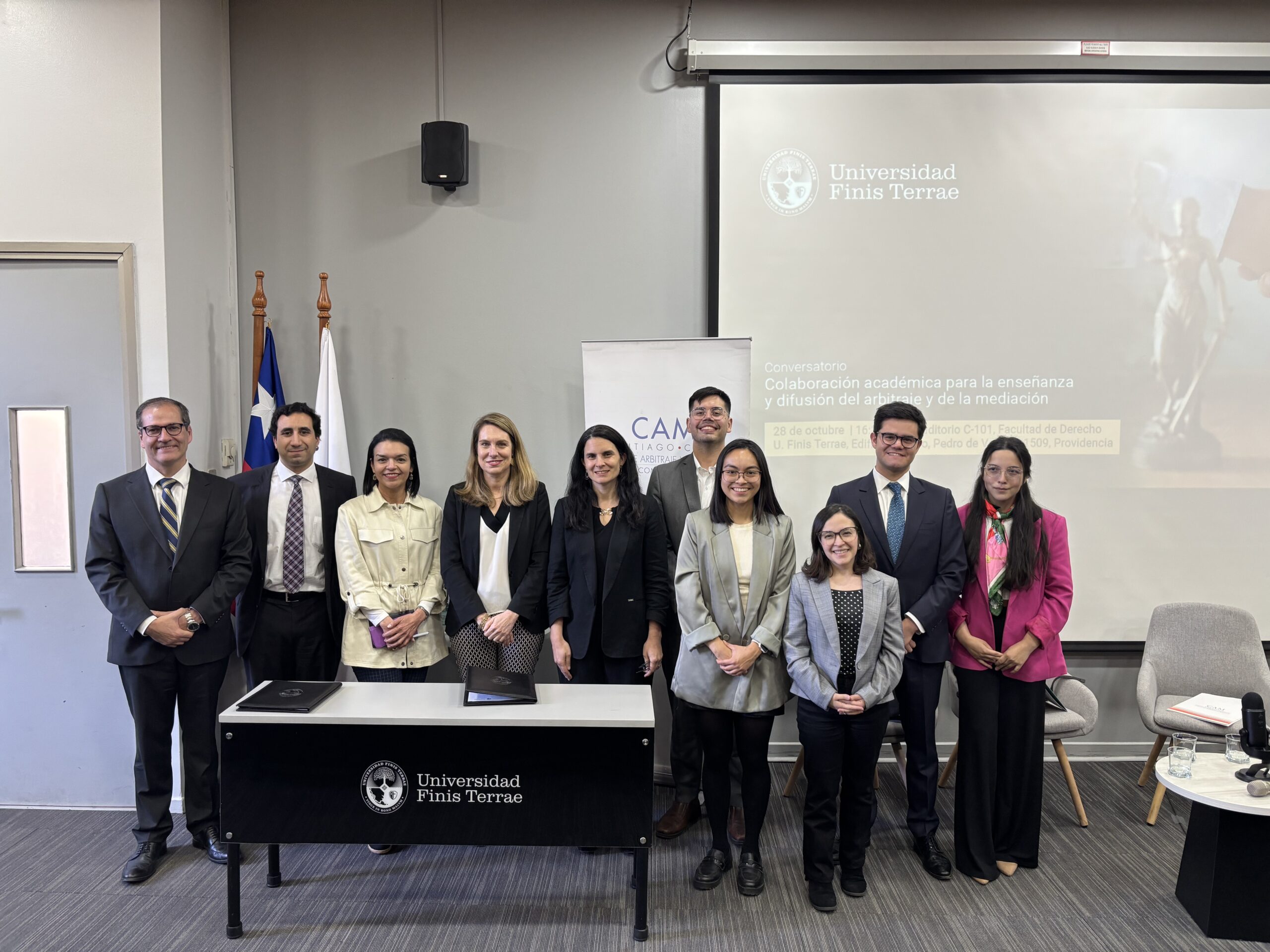 29 de octubre de 2025. En octubre de 2025, el Centro de Arbitraje y Mediación (CAM) de la Cámara de Comercio de Santiago (CCS) y la Facultad de Derecho de la Universidad Finis Terrae (UFT) suscribieron electrónicamente un convenio de colaboración académica y pasantías, con la finalidad de promover y desarrollar los métodos adecuados de resolución pacífica de conflictos entre la comunidad jurídica universitaria. El convenio fue presentado en el «Conversatorio CAM Santiago UFT: Colaboración Académica para la Enseñanza y Difusión del Arbitraje y de la Mediación».