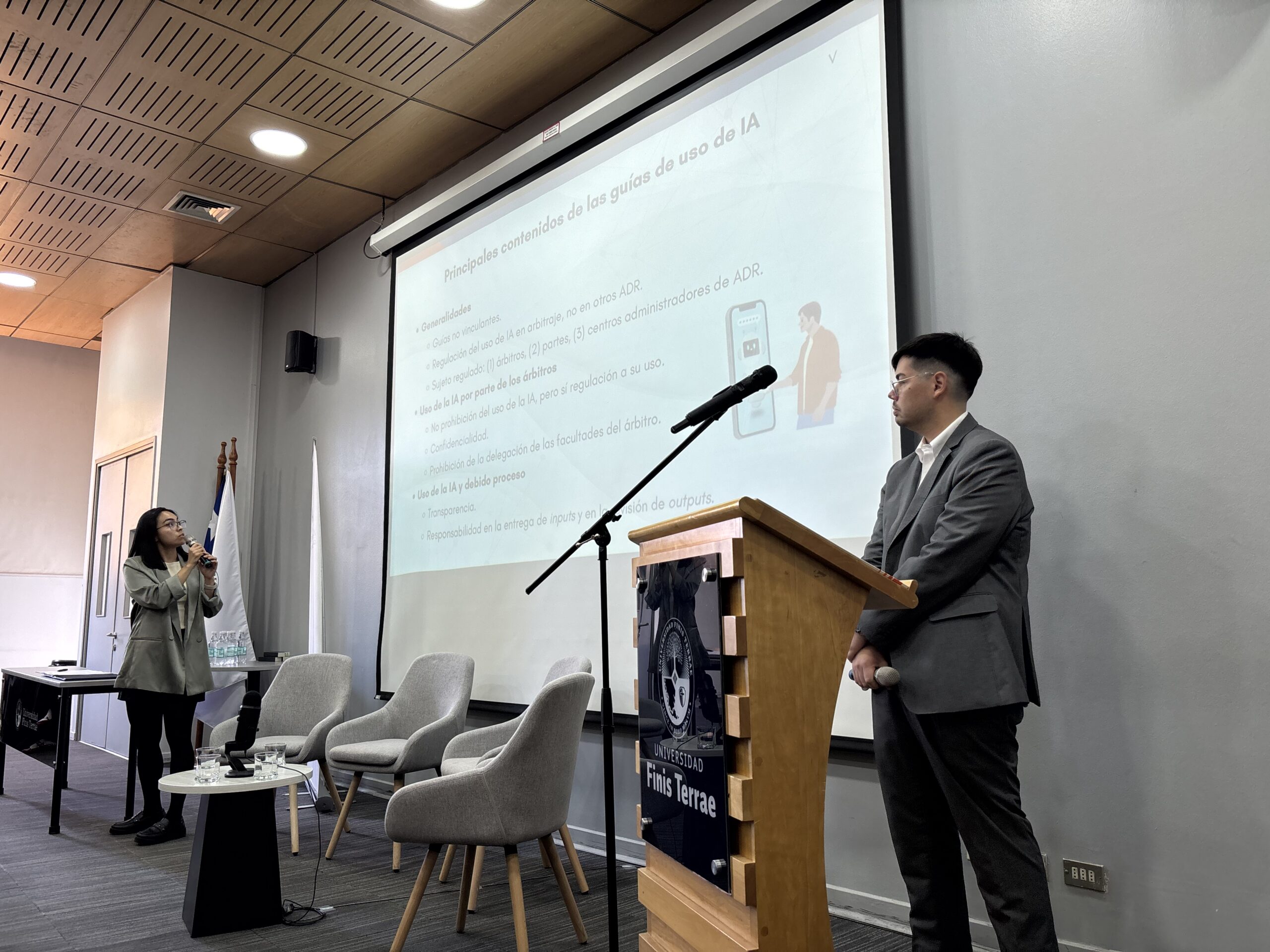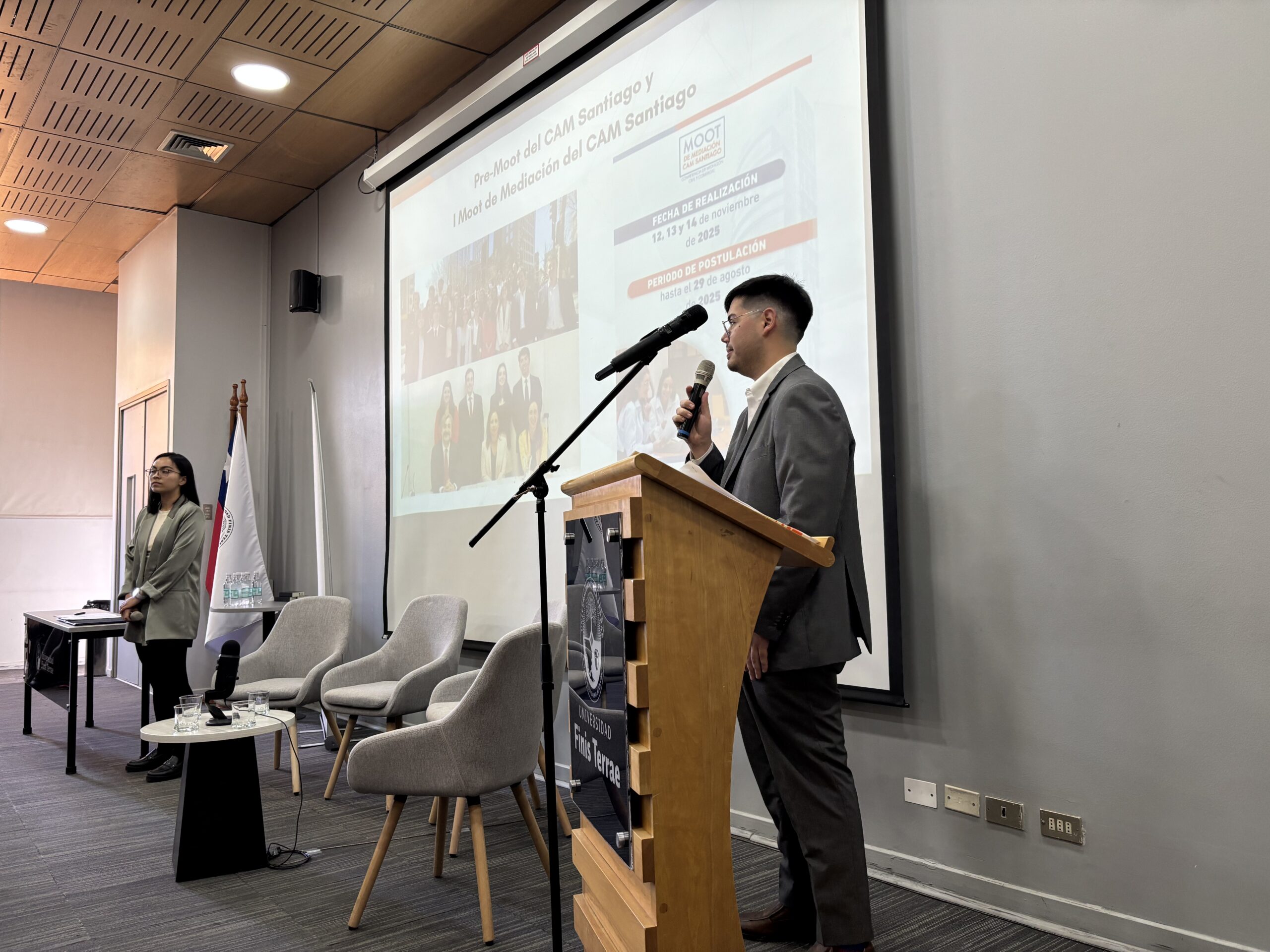 A continuación, tuvo lugar la presentación «El Rol del CAM Santiago en la Promoción del Arbitraje y de la Mediación», a cargo del abogado Claudio F. Osses Garrido y la abogada Victoria Subiabre Chiong (Asistentes de Investigación y Extensión de la Oficina de Estudios y Relaciones Internacionales del CAM Santiago).