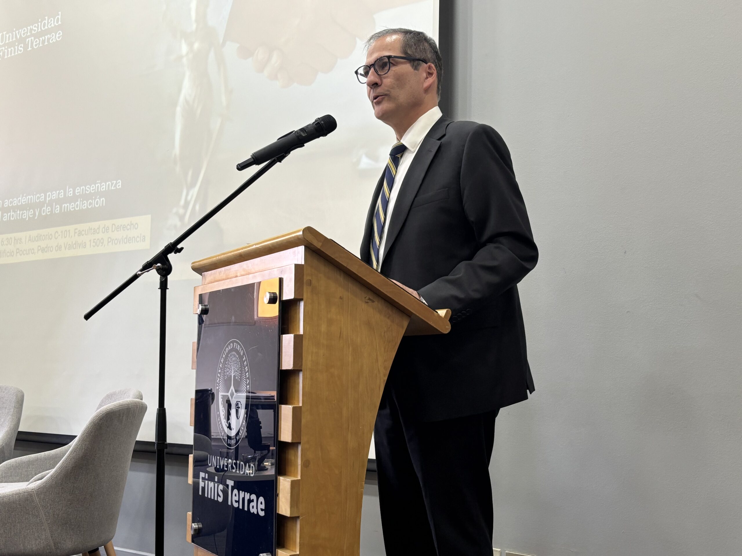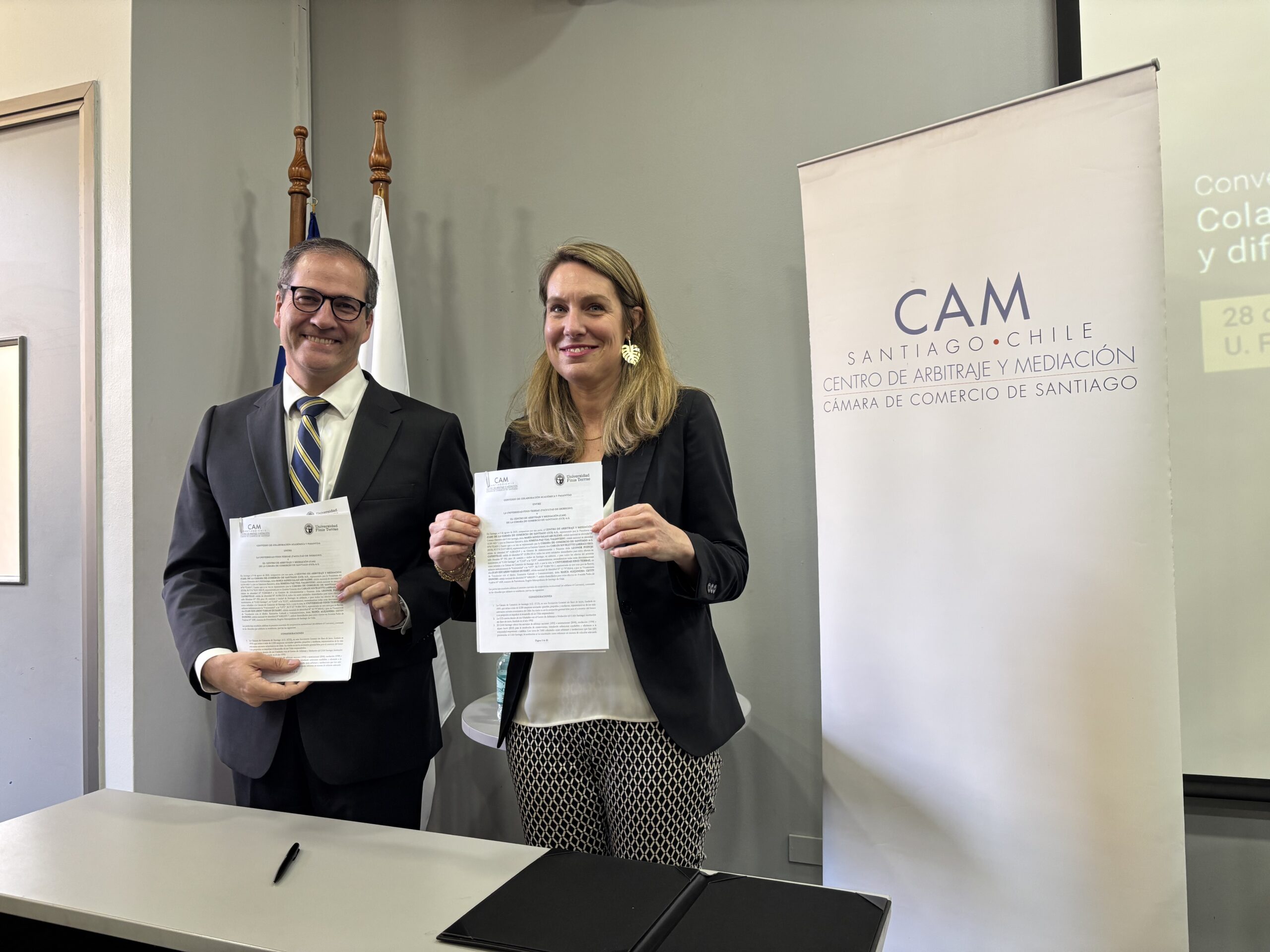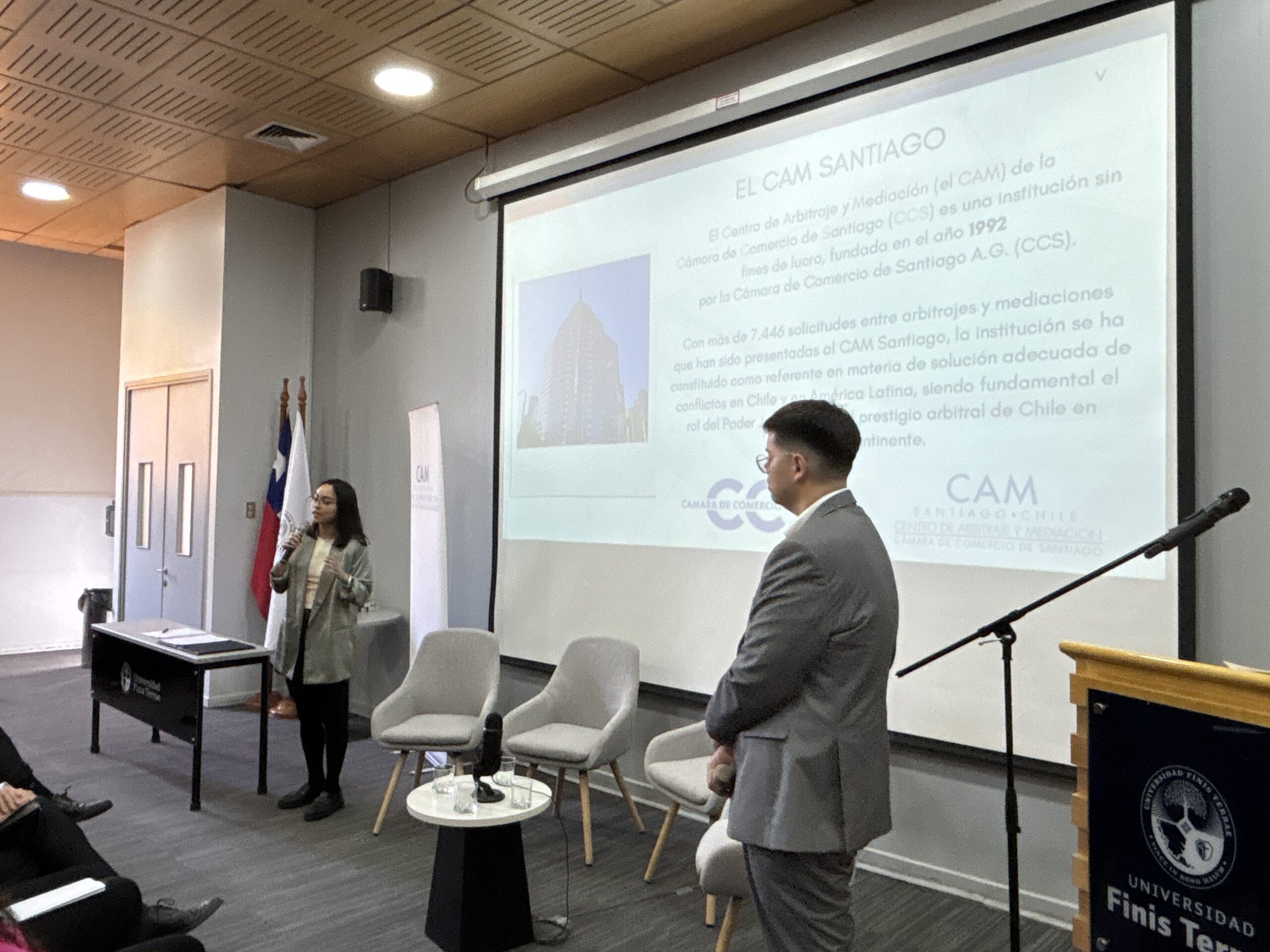 29 de octubre de 2025. En octubre de 2025, el Centro de Arbitraje y Mediación (CAM) de la Cámara de Comercio de Santiago (CCS) y la Facultad de Derecho de la Universidad Finis Terrae (UFT) suscribieron electrónicamente un convenio de colaboración académica y pasantías, con la finalidad de promover y desarrollar los métodos adecuados de resolución pacífica de conflictos entre la comunidad jurídica universitaria. El convenio fue presentado en el «Conversatorio CAM Santiago UFT: Colaboración Académica para la Enseñanza y Difusión del Arbitraje y de la Mediación».