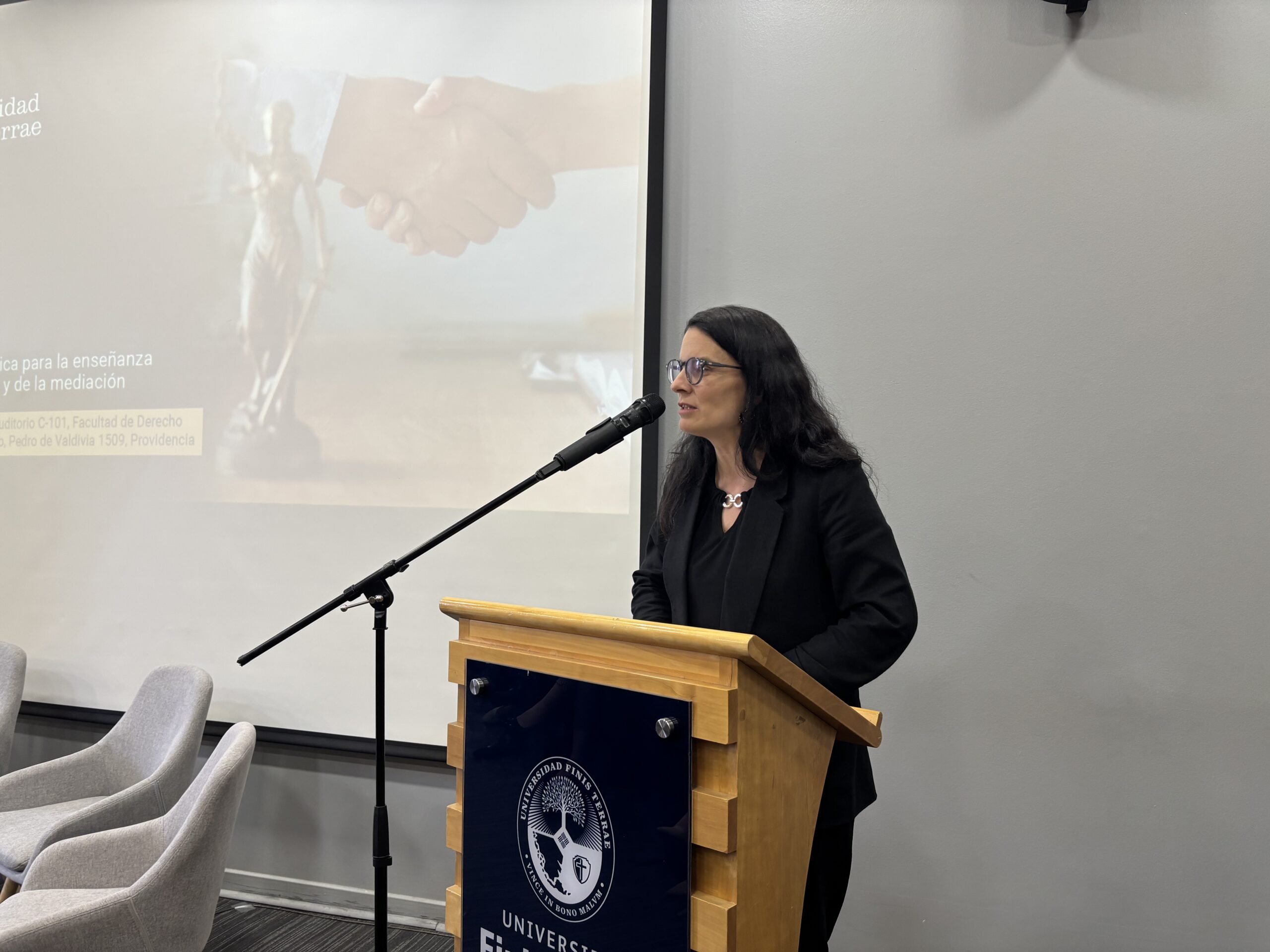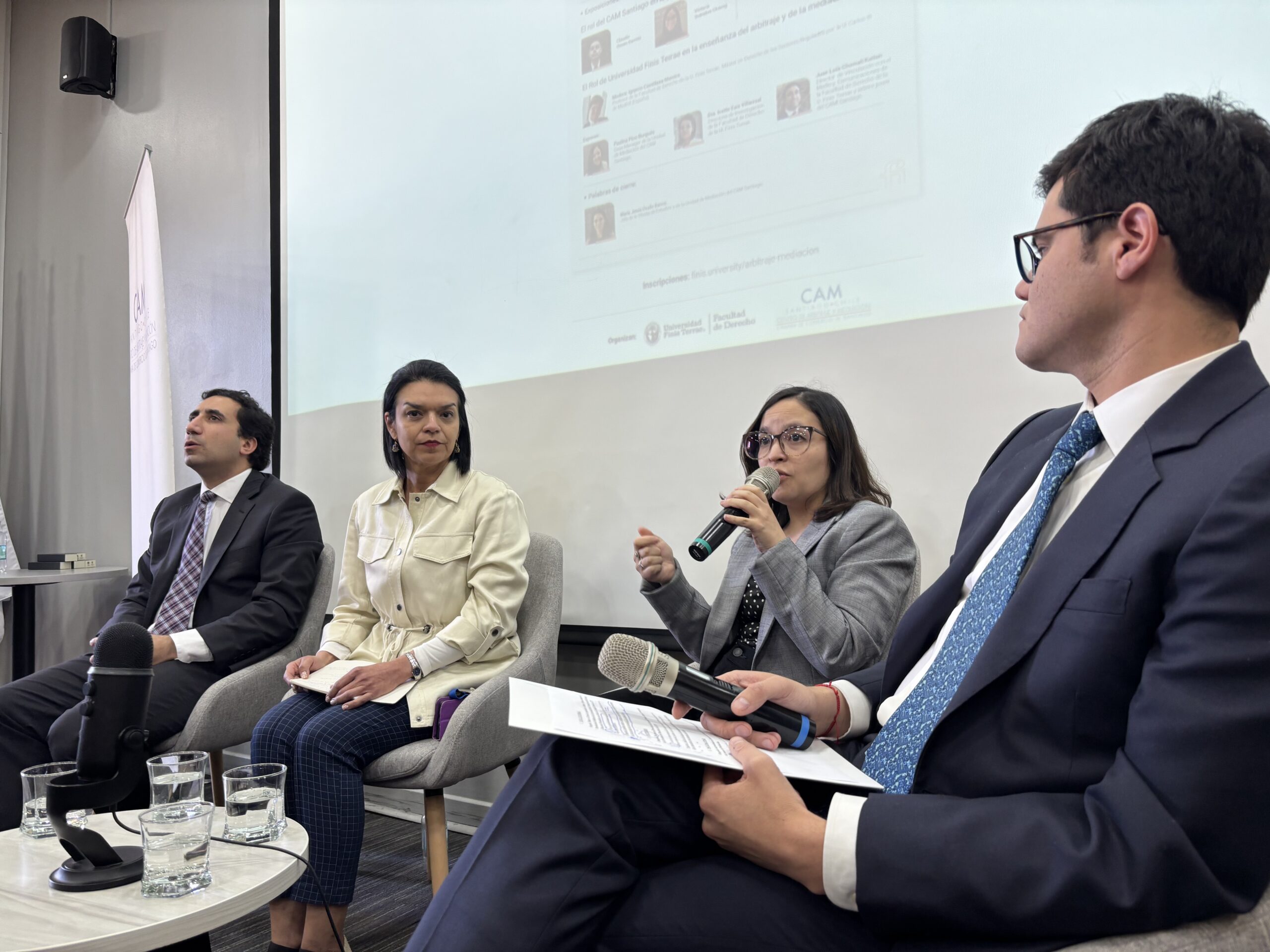 El conversatorio contó con las palabras de bienvenida de Ricardo Jungmann Davies (Decano de la Facultad de Derecho de la UFT) y Ximena Vial Valdivieso (Directora Ejecutiva del CAM Santiago).