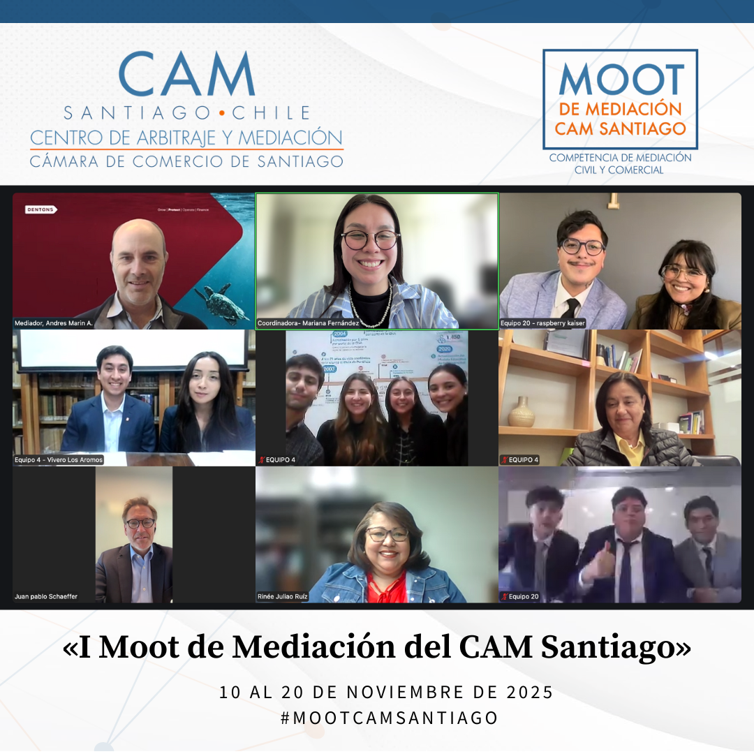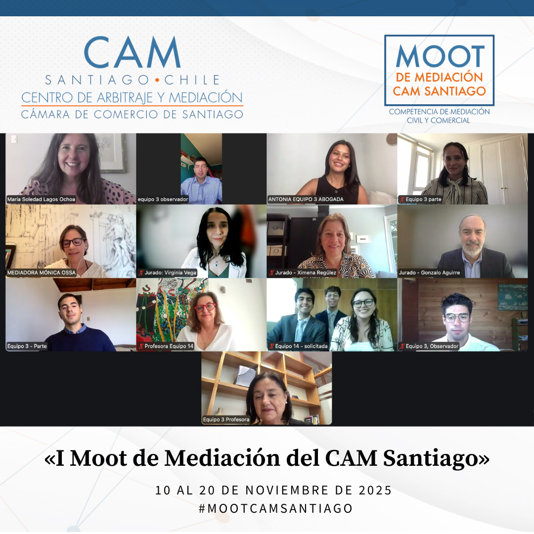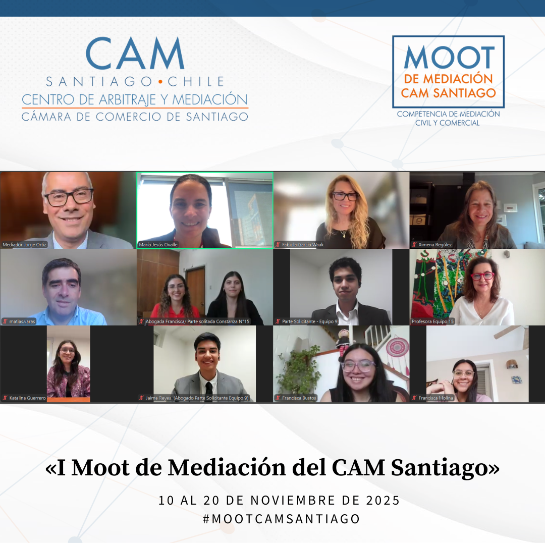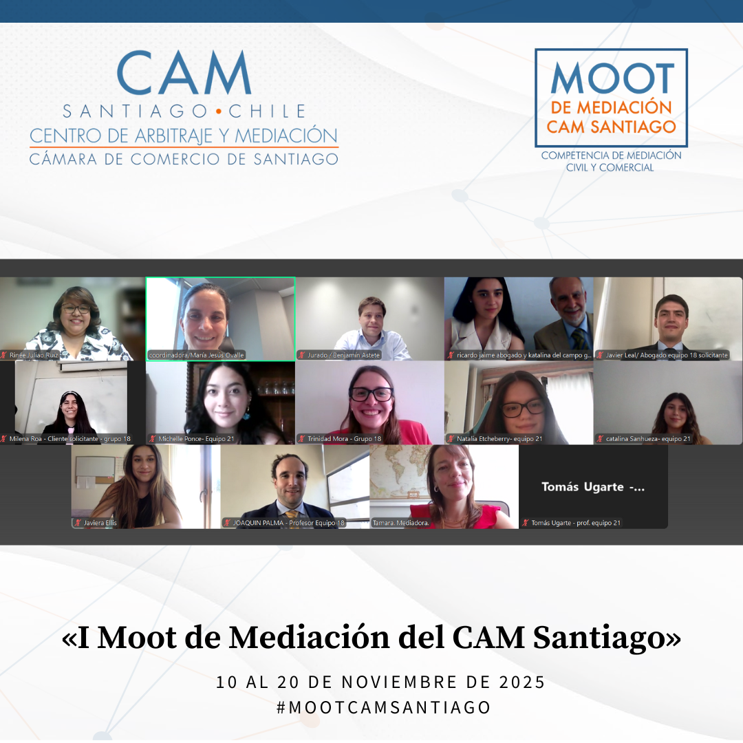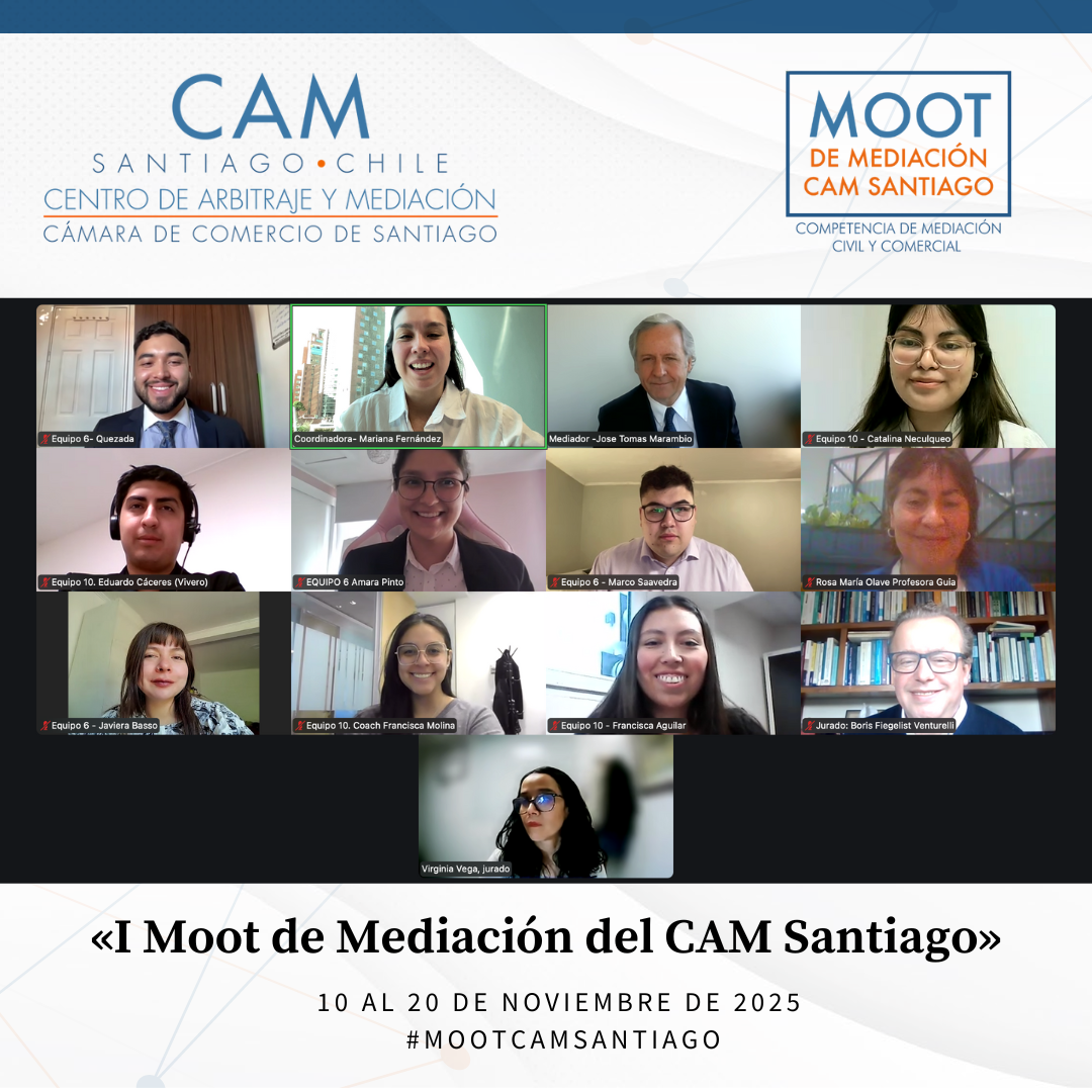 Durante el mes de noviembre de 2025 se llevó a cabo el Primer Moot de Mediación Civil y Comercial del CAM Santiago, cumpliéndose así un anhelo de años del Centro: promover la mediación entre estudiantes de Derecho de todo el país. Esta iniciativa tuvo como propósito fomentar el estudio y la práctica de la mediación como un proceso eficaz para la prevención, gestión y resolución de conflictos, impulsando en los futuros profesionales habilidades avanzadas en negociación, escucha activa, comunicación efectiva y cultura de acuerdo.