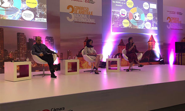 En la oportunidad, la Directora Ejecutiva del CAM Santiago, también participó en la «Conferencia sobre la relación entre centros de arbitraje y poder judicial desde la experiencia chilena», en donde expuso junto a Héctor Carreño Seaman (ministro de la Excelentísima Corte Suprema de Chile) y se refirieron –ante más de 500 asistentes- a la relación de cooperación y respeto entre el Poder Judicial y el CAM Santiago. El ministro Carreño abordó los aspectos más relevantes de la historia del arbitraje en Chile, al principio de intervención mínima que consagra la Ley N° 19.971 y, además, se dirigió a los árbitros colombianos señalándoles que debían “ganarse el respeto de las Cortes”.