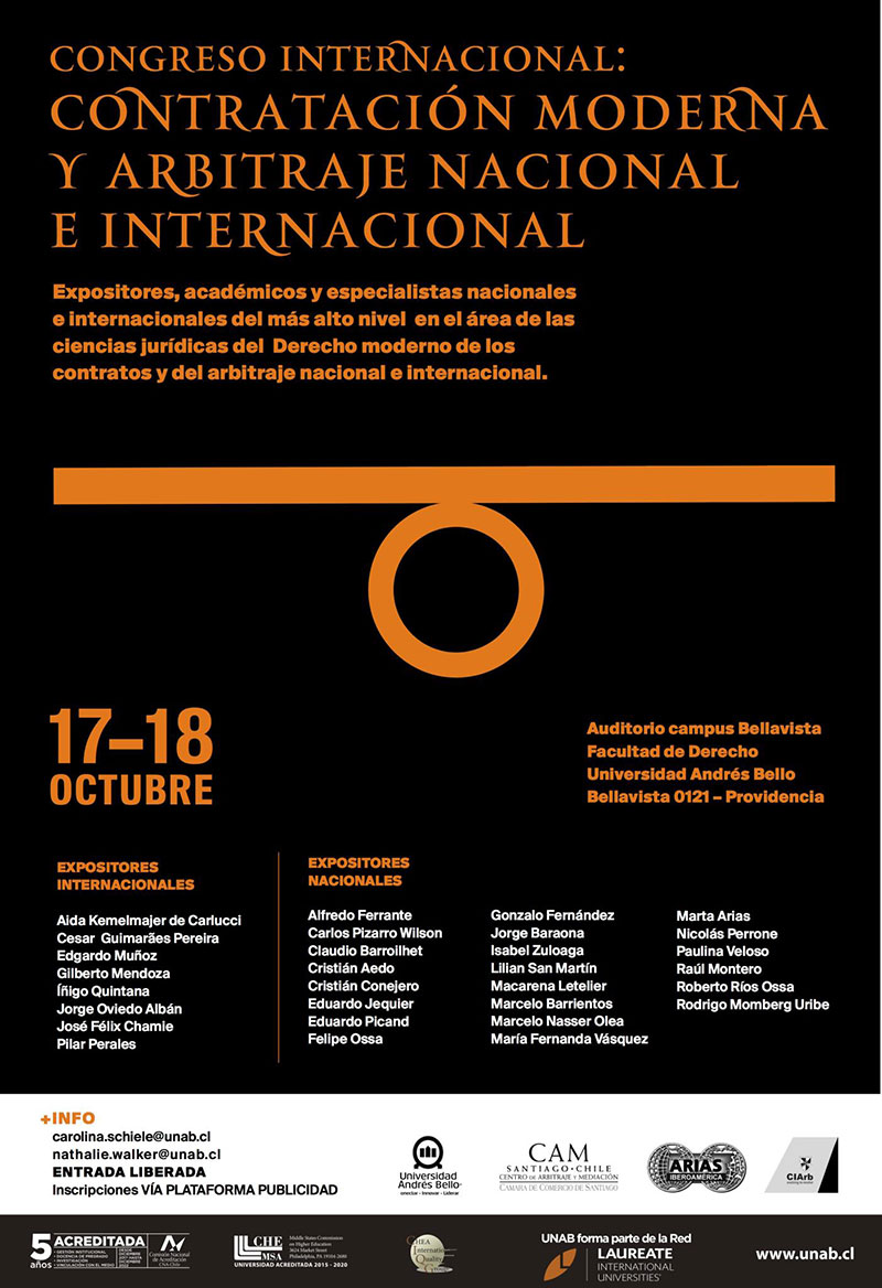 Durante dos días entre el 17 y 18 de octubre, especialistas del mundo jurídico realizaron conferencias y paneles de discusión como parte del Congreso de Contratación Moderna y Arbitraje Nacional e internacional. Organizado por la Facultad de Derecho de la Universidad Andrés Bello, también contó con la participación de integrantes y árbitros del CAM Santiago.