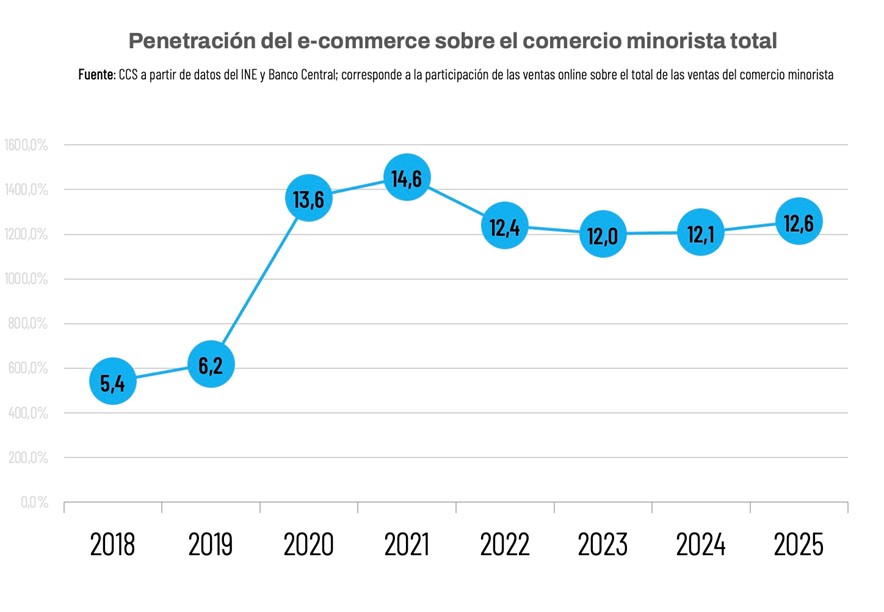 Con estas cifras, la penetración del e-commerce sobre el comercio minorista total aumentó levemente, hasta un 12,6% de acuerdo a las estadísticas experimentales del Banco Central de Chile. Como referencia, antes de la pandemia este indicador se ubicaba en torno a un 6%, y en los años de encierro promedió cerca de un 14%. En el caso de tiendas por departamento, la penetración alcanzó a un 16,1% en 2025, mientras que en vestuario llegó a 14,5% y en supermercados a 8,6% (versus 0,8% en 2019).