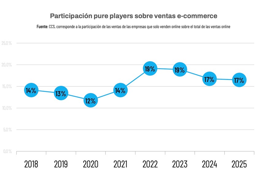 En cuanto a los pure players o actores que se dedican exclusivamente a la venta online (sin tiendas físicas), a partir de cifras del SII estimamos que actualmente suman alrededor de 17 mil empresas, con ventas por más de US$ 1.600 millones y una participación del 17% sobre el total.