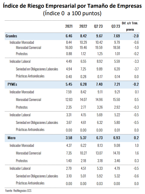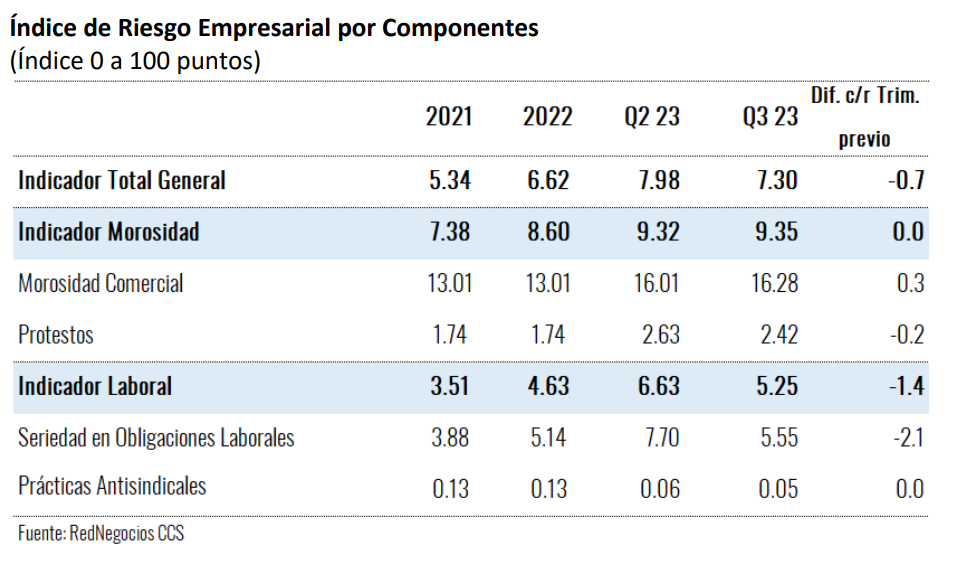 El Índice, que adopta valores entre 0 y 100 puntos, donde 100 representa el mayor nivel de riesgo, se elabora a partir de indicadores laborales (cumplimiento de obligaciones laborales y prácticas sindicales), y de morosidad (cumplimiento comercial y protestos). La base de cálculo se construye a partir de los indicadores de cerca de 7 mil empresas al mes, las cuales forman parte del registro de proveedores de RedNegocios de la CCS.