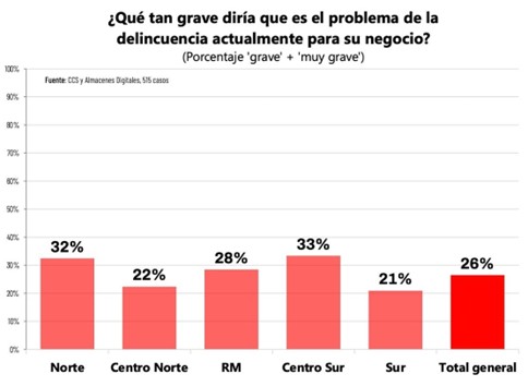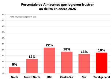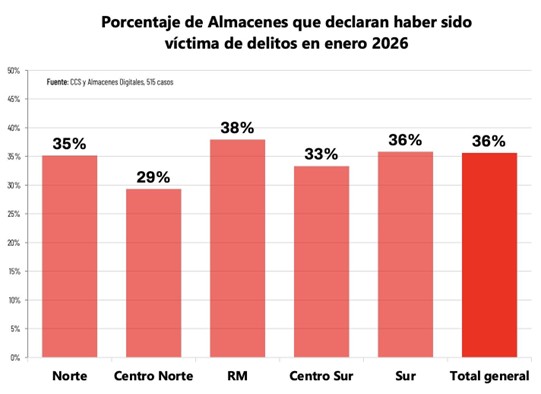 De acuerdo a una encuesta realizada por la Cámara de Comercio de Santiago (CCS) y Almacenes Digitales, el 36% de los almacenes a nivel nacional fue víctima de algún tipo de delito durante enero de 2026. La Región Metropolitana lidera la incidencia delictiva, con un 38% de sus almacenes siendo afectados, superando el promedio nacional. Le siguen las zonas Norte y Sur, con una tasa de victimización en torno al 35%, mientras que la Zona Centro Norte presenta la menor tasa de victimización (29%), situándose 7 puntos porcentuales por debajo del promedio general.