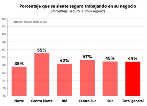 Finalmente, menos de la mitad de los encuestados (44%) declara sentirse seguro trabajando en su negocio. Este sentimiento es especialmente preocupante en la Zona Norte, donde retrocede a solo un 38%, correlacionándose con su alta tasa de denuncia y baja tasa de frustración de delitos.