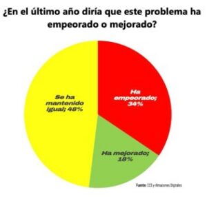 Al consultar sobre la trayectoria de la delincuencia en el último año, un 34% afirma que la situación ha empeorado, mientras un 48% percibe que se ha mantenido sin cambios y solo un 18% percibe una mejoría.