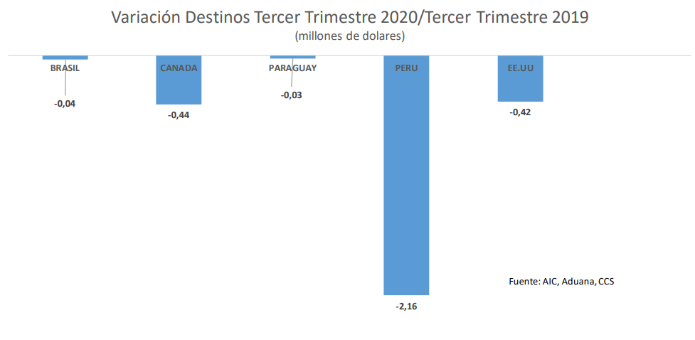 En efecto, las ventas de servicios de ingeniería al exterior apenas alcanzaron los US$ 11 millones en el tercer trimestre de 2020. La merma es explicada casi en su totalidad por el fuerte retroceso de los envíos a Perú, que cayeron en más de US$ 2 millones, representando un retroceso del 16% respecto al mismo período del año anterior. Por otra parte, se observa que prácticamente desaparecieron los envíos de servicios de ingeniería a otros destinos durante este trimestre del año, concentrándose aún más las ventas hacia Perú.
