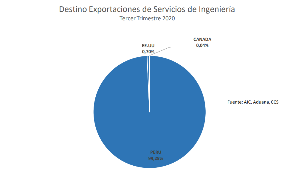 Como se mencionó, las exportaciones de servicios de ingeniería chilena se concentraron aún más en Perú, con un 99% de participación, seguido muy por detrás de EE.UU, con un marginal 1%.