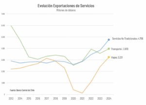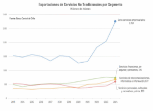 El gran desempeño de las exportaciones de servicios no tradicionales es explicado principalmente por el fuerte crecimiento que han experimentado las ventas al exterior de servicios empresariales, que superaron los US$ 2.700 millones el año pasado, con un 35% de incremento respecto a la cifra de 2023.