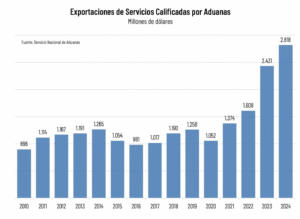 Los servicios calificados como exportación por el Servicio Nacional de Aduanas, que corresponden a un subconjunto de los datos capturados por el Banco Central, se han duplicado entre 2021 y 2024, superando los US$ 2.800 millones el último año.