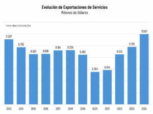 Las exportaciones chilenas de servicios alcanzaron cerca de US$12.000 millones en 2024, marcando un máximo histórico para el sector. Esta cifra, además, duplica la registrada en 2021, acumulando crecimientos del 46% en 2022, 15% en 2023 y 22% el año pasado.