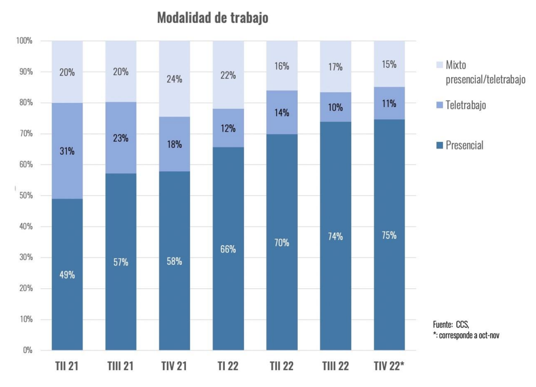 En el caso de las modalidades de trabajo, esto se ha traducido en un progresivo retorno a los espacios físicos de actividad, alcanzando el formato exclusivamente presencial su nivel más alto desde el inicio de la pandemia, un 75% para lo que va de este último trimestre del año