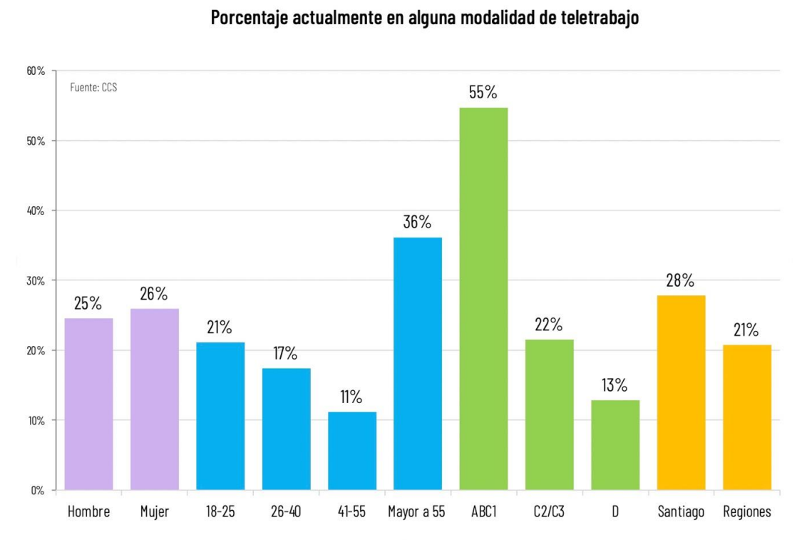 Desde el punto de vista geográfico, la proporción de teletrabajo es mayor en la capital (28%) en comparación con regiones (21%).