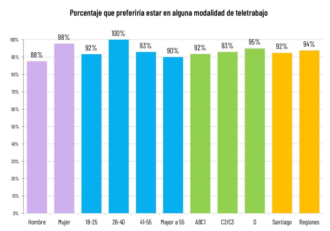 Las mujeres manifiestan una mayor preferencia por esquemas remotos de trabajo, con un contundente 98% (vs 88% de los hombres).
