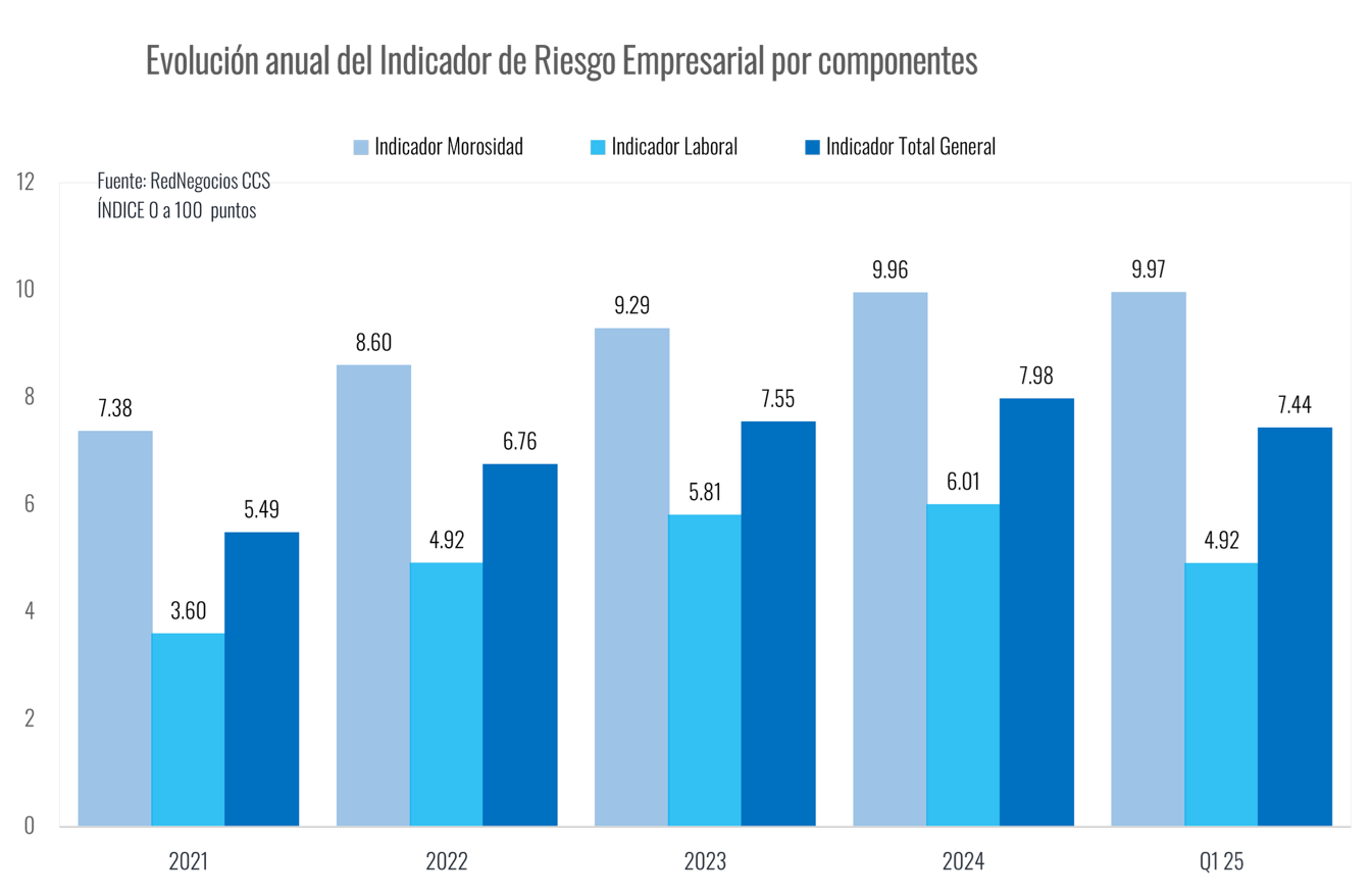 El Índice, que adopta valores entre 0 y 100 puntos, donde 100 representa el mayor nivel de riesgo, se elabora a partir de indicadores laborales (cumplimiento de obligaciones laborales y prácticas sindicales), y financieros (cumplimiento comercial y protestos). La metodología es aplicada mensualmente a una muestra con más de 7 mil, las cuales forman parte del registro de proveedores de RedNegocios de la CCS.